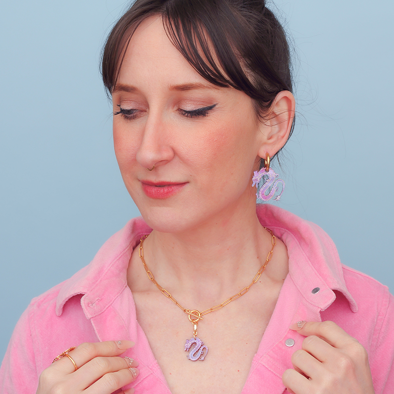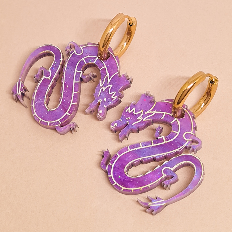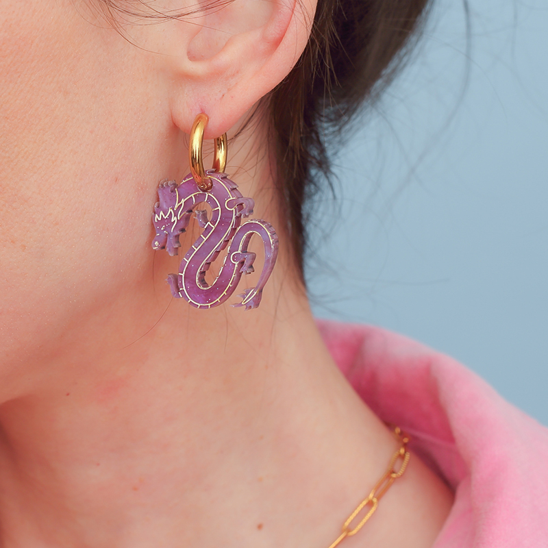 Superbes créoles Dragon violet galaxie, symbole de force et de protection. Symbole de sagesse et de puissance intérieure, ces créoles Dragon du Japon sont un bijou talisman pour affirmer sa force avec mystère et élégance.